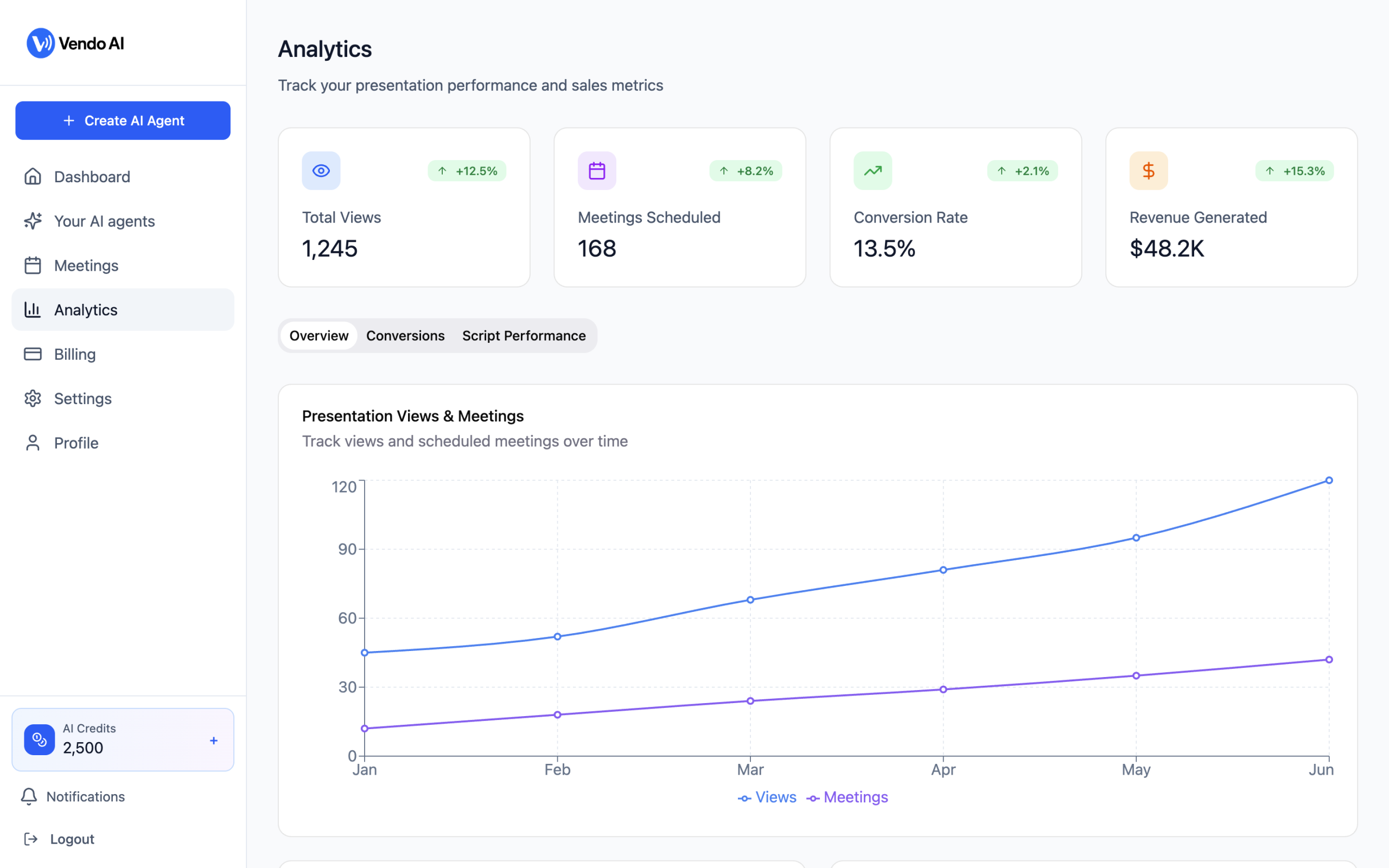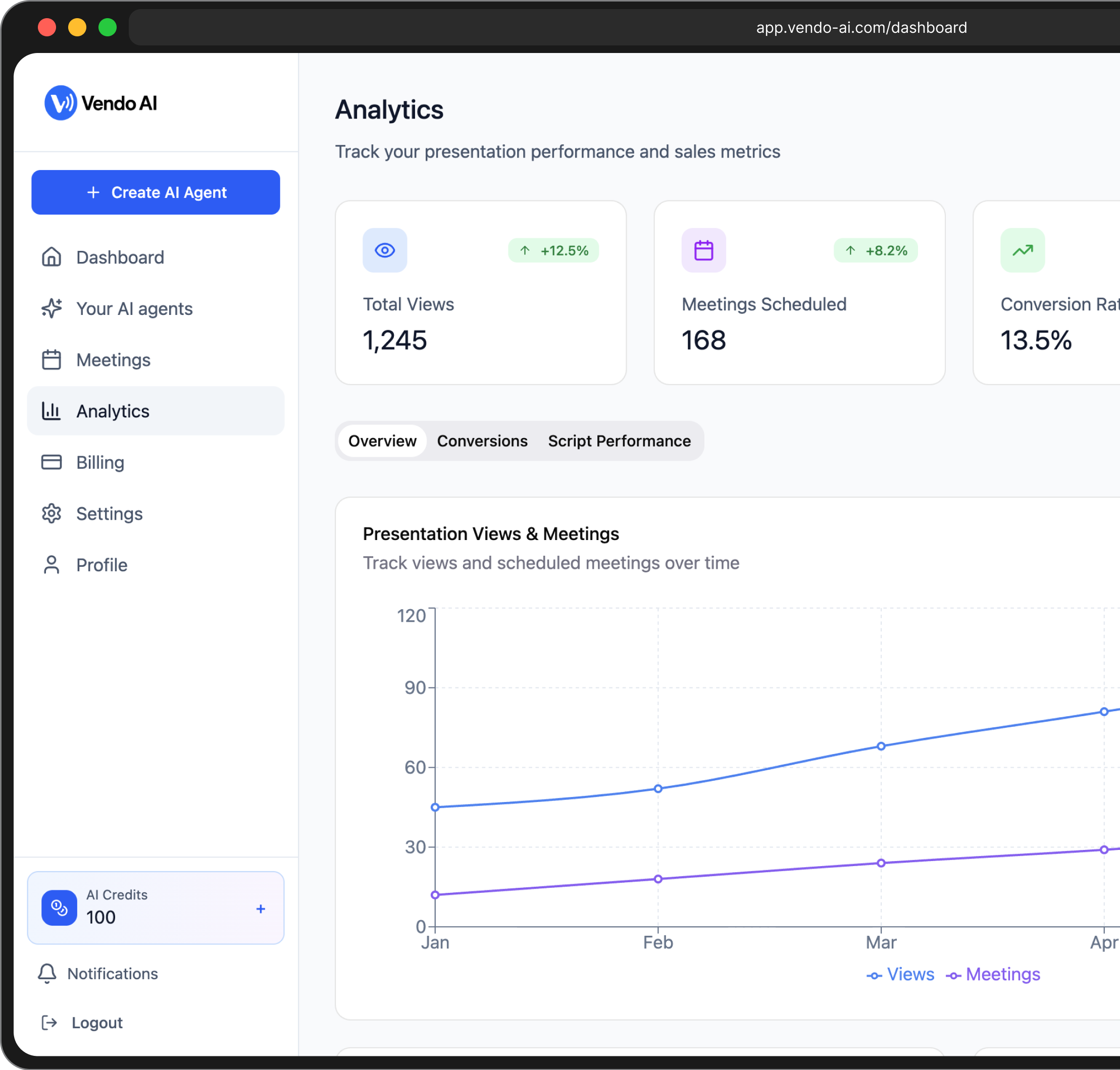 You schedule or join a meeting as usual and add Vendo AI as a participant. It follows the prepared script, shows slides, and answers scoped questions during the call, while you stay free to jump in when needed.
