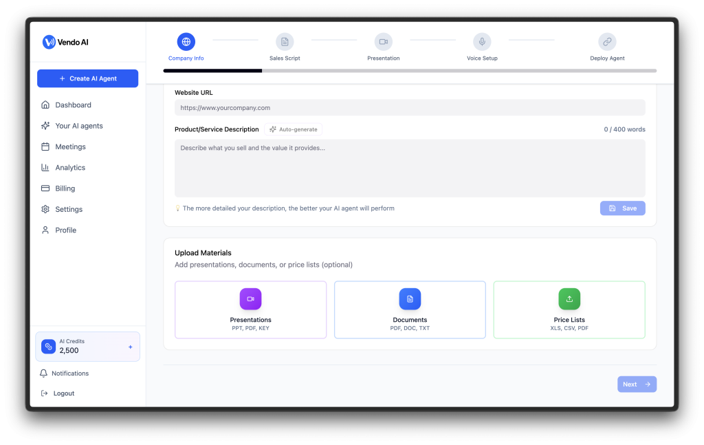 Upload your website, documents, videos and pitch decks to create a unified demo. Vendo AI captures your narrative once and delivers it consistently in every call and on your website.